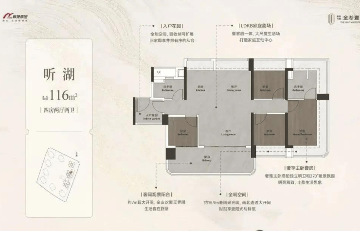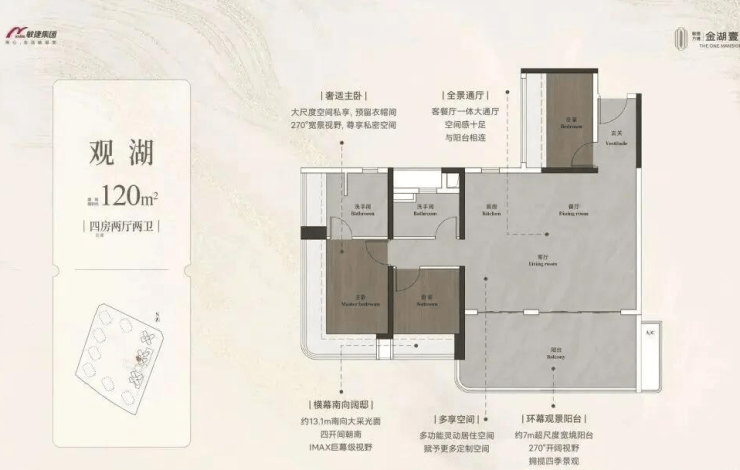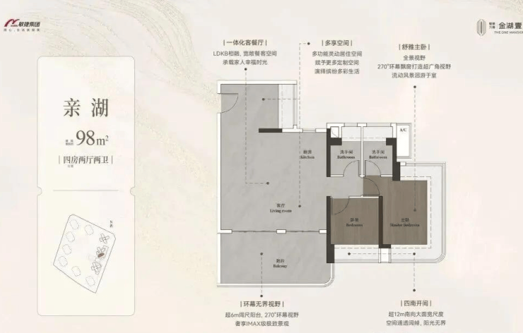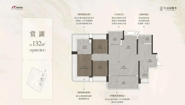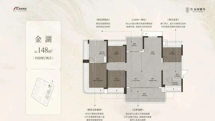 约98-148㎡全南向湖居四房,对标当代华宅范本,创变居住空间的新想象;全南向新规的突破、环拥天地的居住空间、精工雕琢细节之美,打造湖居理想之家,为万博CBD钜献湖居壹号作品。