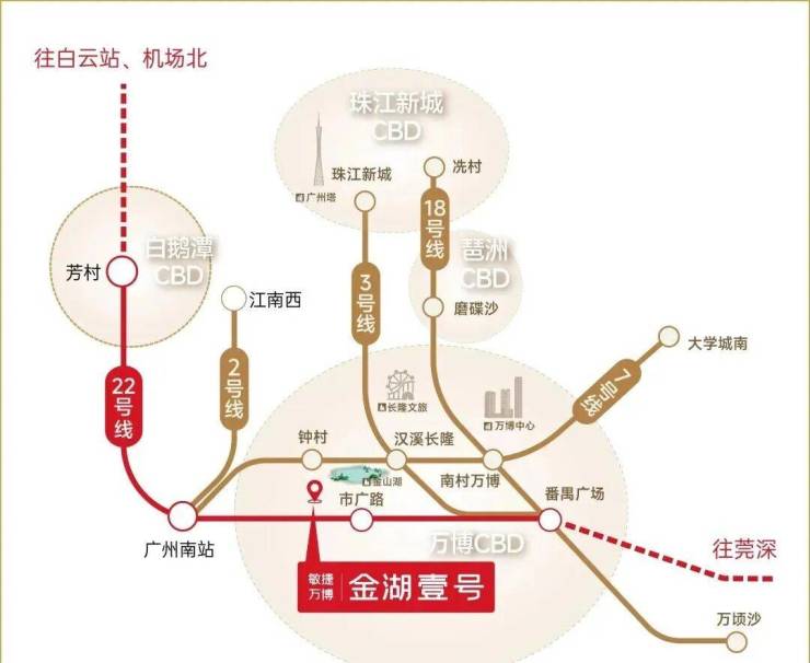 01交通配套 项目附近有22号线(已开通)及26号线(规划中)双地铁交汇,约800米到达,1站番禺广场、2站万博中心,3站琶洲CBD、4站珠江新城。自驾方面,可通过市广路、金山大道快速接驳新光快速、华南快速。