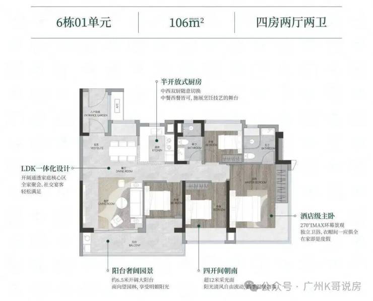 按照规划,项目商品房位于地块西侧,包括6栋层26-33层住宅,以T5风车型全南向户型规划布局。容积率3.4,计容建面9.86万㎡,得房率基本超100%,拥有1.8万㎡围合式大园林及1.5万㎡红线内外绿化与江景资源,致力打造成白鹅潭品质舒居标杆。