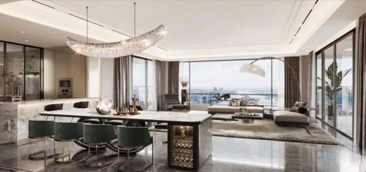 空中庭院与客餐厅融为一体,近70㎡客餐厅与景观阳台一起接近100㎡,尺度感非常霸气,270°度采光及环幕视野,窗外一望,就是缓缓流淌的东江IMAX江景,以及龙湾公园怡人景色,极为惊艳和震撼。