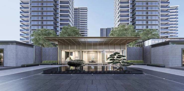 小区采用酒店式门楼入堂,对标国际级酒店打造,门口选取名贵精品罗汉松造景,水景石材选用蓝钻石材,满满的仪式感和尊贵感。