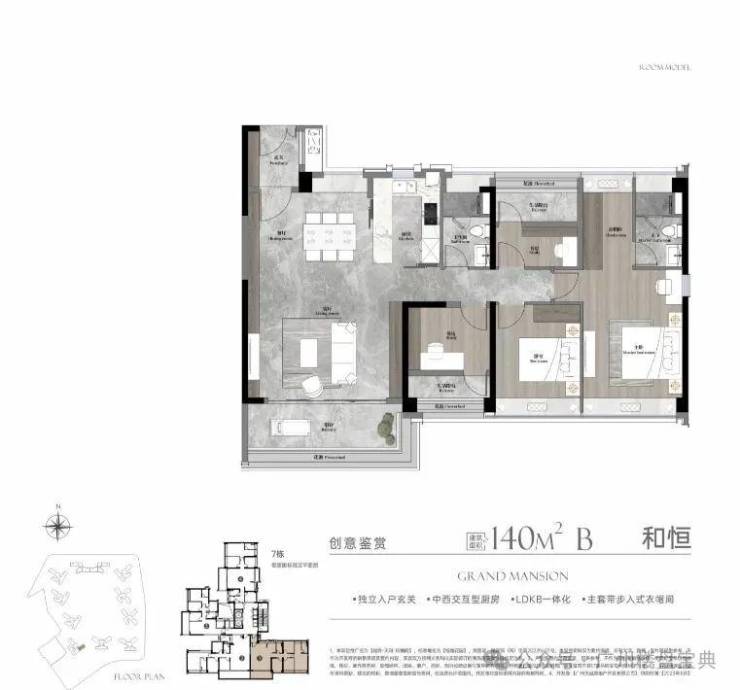 建面140平四房,动静分区、全屋全明设计,入户玄关,约8米双连宽景阳台,LDKG一体化设计,主卧小家化。