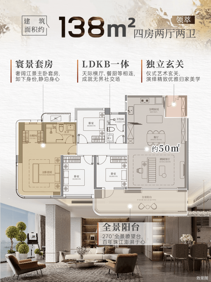 总的来说,除了有创新LDKB、270°揽景主卧等高规格配置,室内空间尺度也非常大气,环幕观景套房、270°全景瞭望台...都融合在一个项目里。