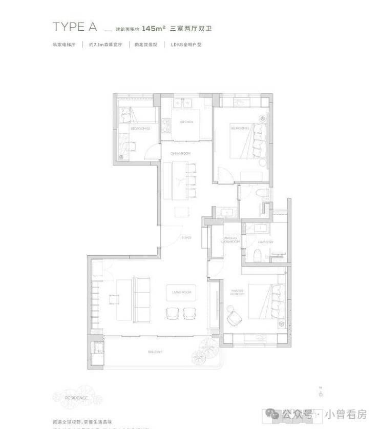 145产品为三房两厅两卫产品,餐厨一体化设计, 7米宽厅可切换各种生活场景,畅享宽幕般景观界面。