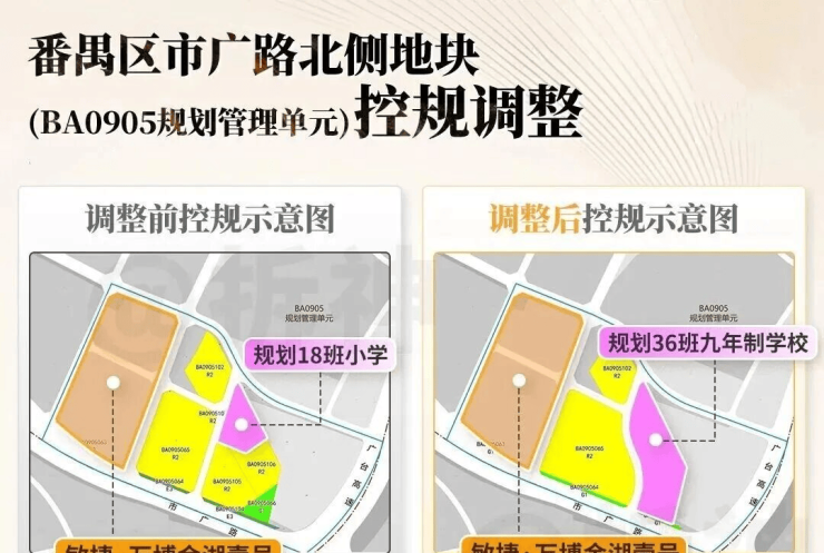 项目配建12班幼儿园,规自局公布调规方案,市广路北侧地块调规为36班九年制学校。(市广路北侧地块控制性详细规划局部调整批前公示)