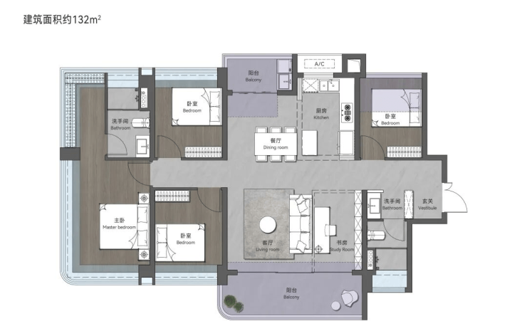 132㎡创意四房两卫,西南向,超50㎡大方厅,格局大气阔绰通透