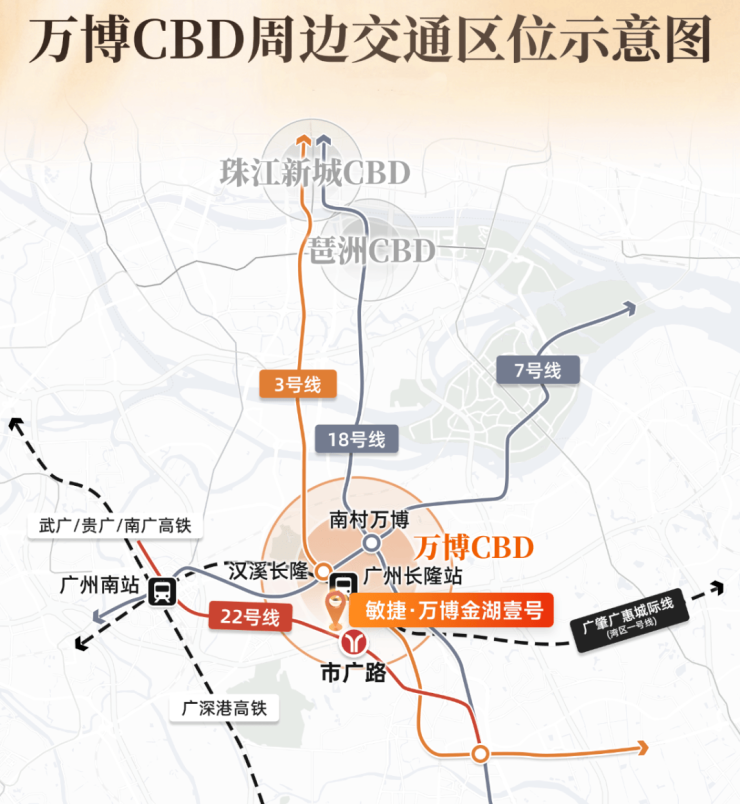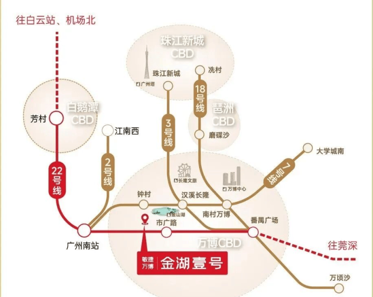 出门约800米即达22号线地铁市广路站(百度地图直线距离),1站番禺广场、2站万博中心、3站琶洲CBD、4站珠江新城;规划中26号线更是潜力可期。