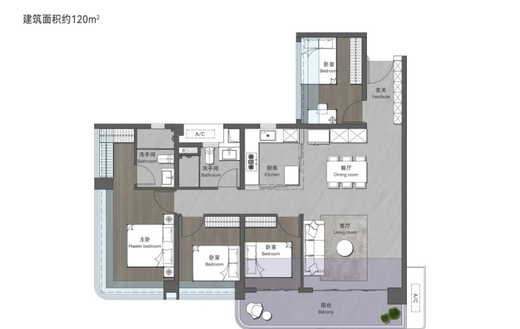 123㎡创意四房两卫,约15.9m奢阔采光面,南北通透大开间,时刻享受阳光与鲜氧