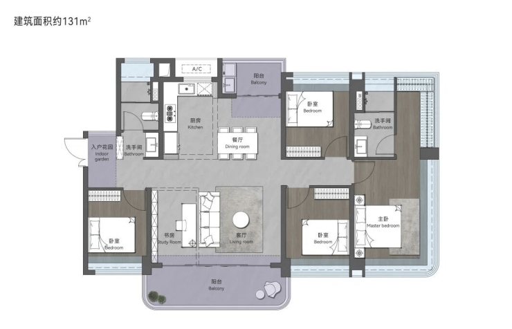 149㎡创意四房两卫,超大横厅连接环幕阳台,南北双阳台