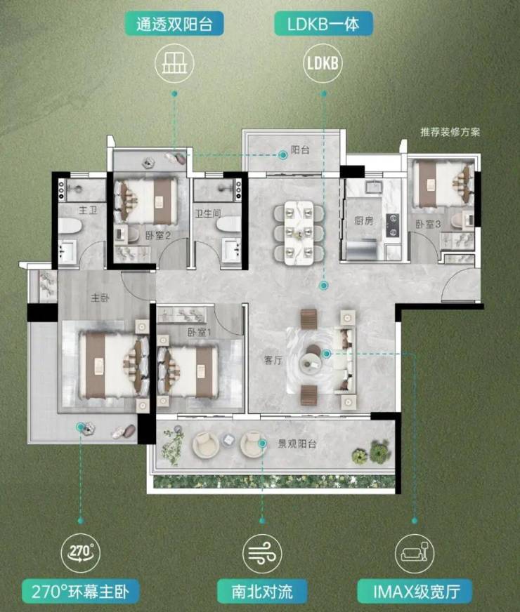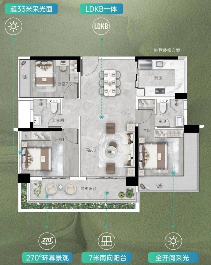 配置长7米的南向阳台,270°主卧观景舱,约33米采光面,视野和景观面实现最大化。