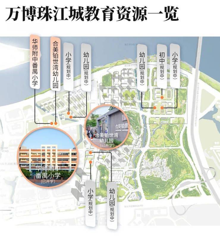 项目自身配建一所 24 班的公立小学,是华师附中番禺小学且目前已开学,符合人户一致的业主子女均可入读,学位稳定且生源纯粹。同时还有 12 班的公立合美铂世湾幼儿园,二者距离小区都很近,方便家长接送孩子上下学。在万博区域住宅配建学校稀缺的情况下,珠江铂世湾从幼儿园到小学的公立教育资源,对追求优质教育的家庭而言,无疑具有强大的吸引力。