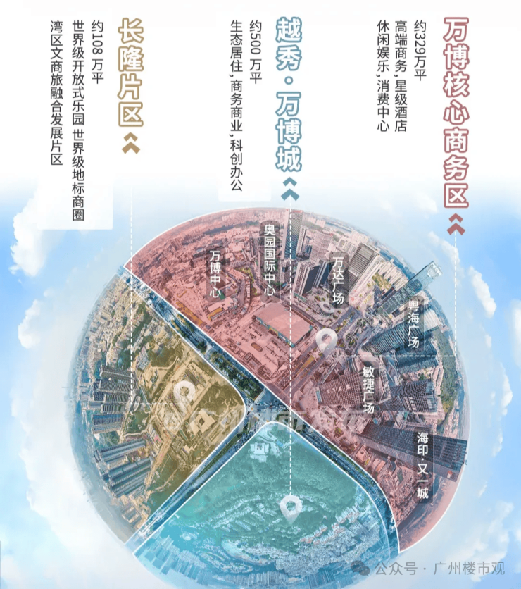 去年4月,万博官宣扩容,占地面积由1.5平方公里延展至7.2平方公里,覆盖长隆、里仁洞片区,规模甚至超越6万平方公里的珠江新城,剑指世界级地标商圈。