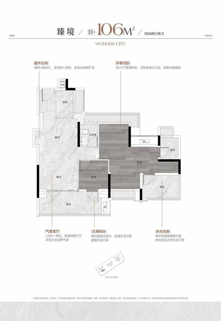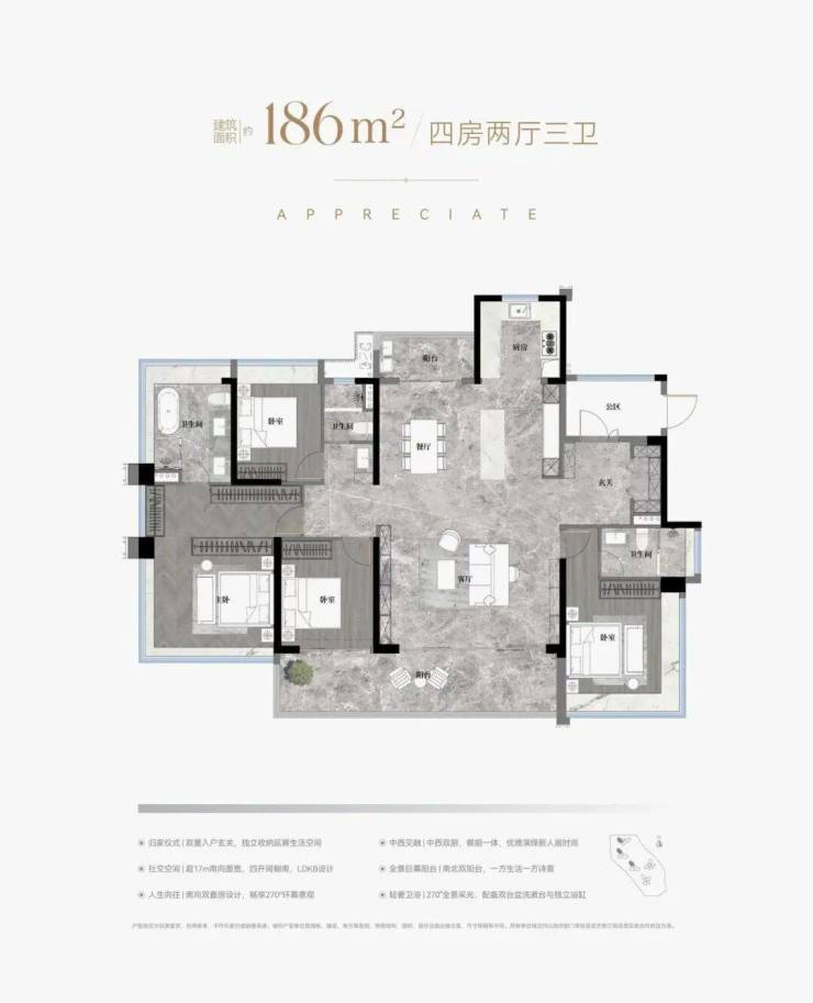 ,南北通透格局,多开间朝南,得房率高达120%,双卫设计保障隐私,适配二胎/三代同堂家庭。