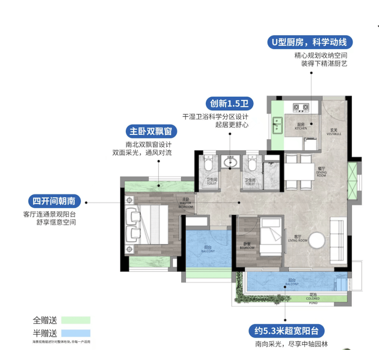 78㎡三房两厅两卫,全新升级三房,四开间朝南,超11米南向采光面,270度超大角度采光,直望广阔园景。