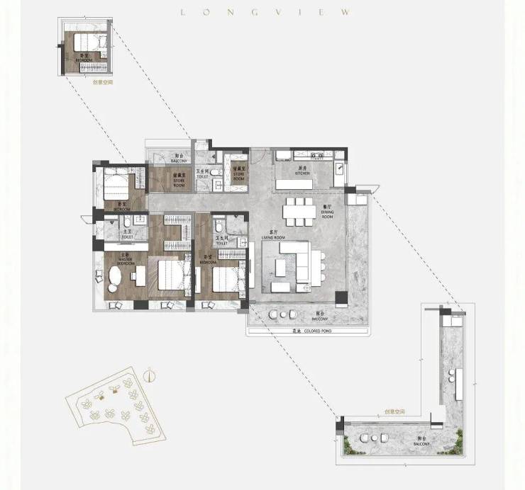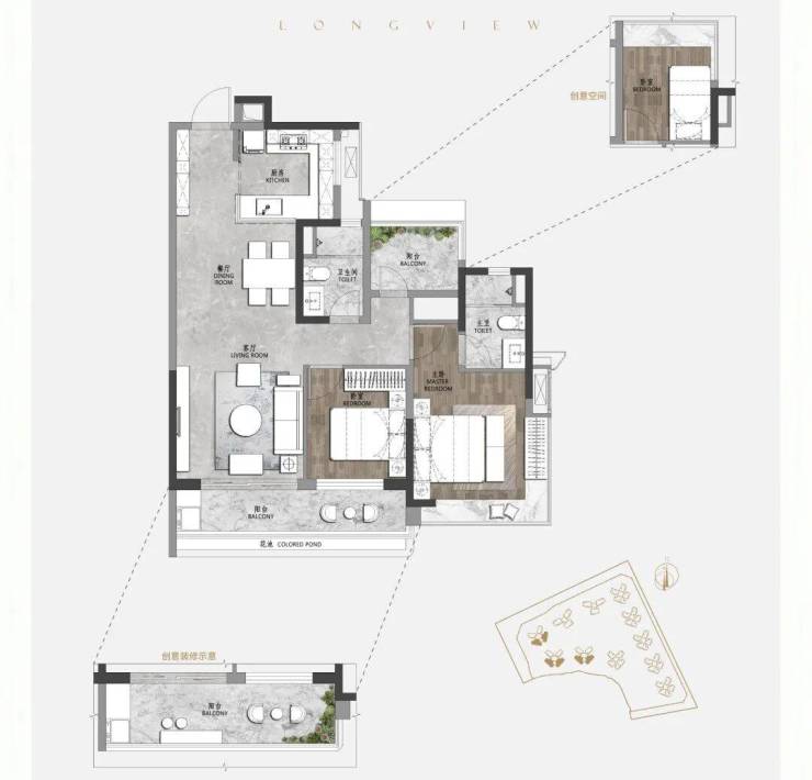 建面约128㎡四房两厅两卫,超8米阳台,连通次卧;主卧配置270°宽敞飘窗,采光面更宽,模糊了室内外的空间边界感;飘窗近0.7m,方便根据自己的需求进行更多改造。