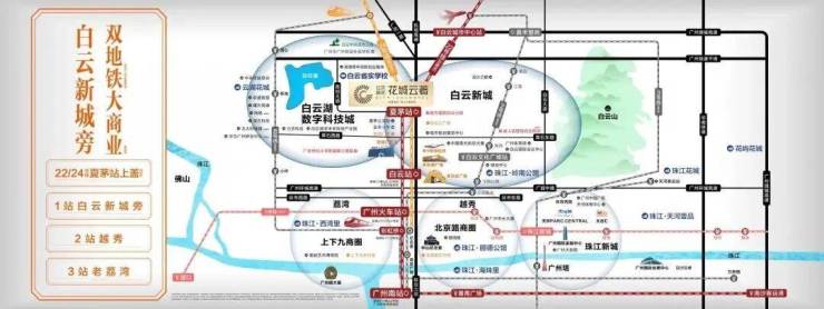 约20米地铁22/24号线夏茅站,乘22号北延线,1站白云棠溪,2站越秀广州火车站,3站荔湾彩虹桥,换乘5号线直达珠江新城。乘24号线,迅达白云、越秀,串联广州北站和白云棠溪TOD。