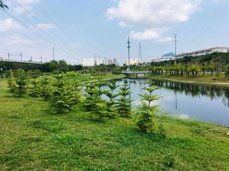 抱坡溪湿地公园位于三亚荔枝沟片区,东至技工学院路,西至师部农场路,北至海南东环线,南至荔枝沟路,规划用地总面积约28.7万平方米。园区将分为四个区,分别为入口服务区、康体运动区、生态湿地区及田园风光区。入口服务区面积约3万平方米,依据公园地形及周边用地和交通情况,全园有3处主要入口区域,包括1个主入口和2个次入口,主入口设置有特色海洋雕塑和迎宾通道,烘托主题特色;康体运动区面积约4万平方米,位于公园南北两侧,共设置了1个排球场、2个篮球场、5个羽毛球场及9个乒乓球场;生态湿地区面积约12万平方米,设计结合抱坡溪,设计了亲水栈道和亲水平台,为市民提供休闲的空间;田园风光区面积约9万平方米,结合现状稻田,设置田园观光基地,为市民提供亲近自然、放松自我的空间。入口服务区将选择盆架子、秋枫、小叶榕、高山榕、凤凰木、木棉、菩提树、雨树等乔木,体现优美、大气、自然;康体运动区将选择酸豆、雨树、榕树、麻楝、印度紫檀、火焰木、凤凰木等乔木,体现健康、活力、清新;生态湿地区将选择秋枫、乌墨、血桐、蒲桃、黄槿、红千层等主要植物,体现生态、野趣、科普;田园风光区将种植一些荔枝、龙眼、芒果、莲雾、香蕉等观赏性水果树种及芡实、荷花、南瓜、蛇瓜、丝瓜、番茄等观赏作物和观赏性瓜果,体现稻田、菜园和生态。