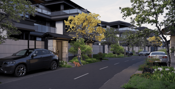 以五重归家礼序打造社区归家动线:一进府门,二进山门,三进雅苑,四进院门,五进宅门架空层,从室外到室内一脉相承,形成以琴棋书画、诗酒花茶为主题的八大雅集山居生活体验,打造可游可居,可玩可赏的高端私享会所空间。别墅配套专属地面车位,地面采用彩色沥青,周围结合组团绿化,让停车空间更舒适。
