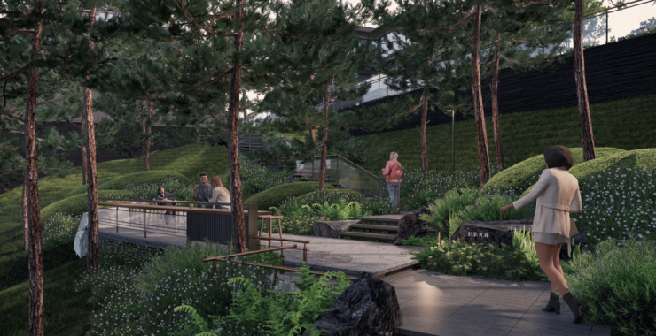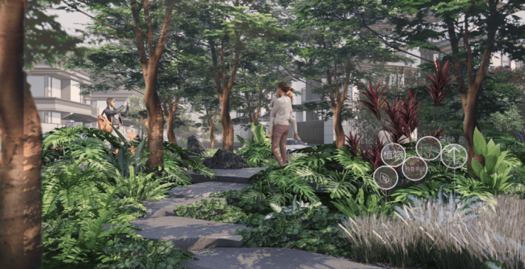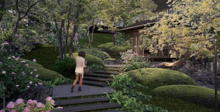 植物设计依据地形空间情况,打造独特植物氛围感受;山坡、山丘、山谷的空间植物基调分别为山花浪漫、雅致山林、阔叶竹林。