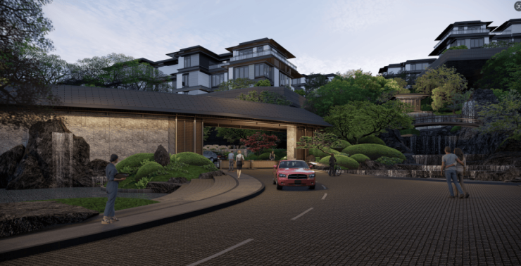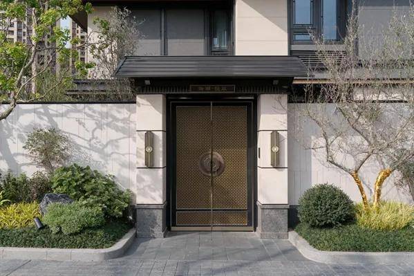 主入口为弧形环抱山门的形式,门楼挑高超4.2m,结合外界面围墙一体化设计,顶部浅金色铝板,花岗岩石材外墙和金属外墙结合,打造具有宋韵雅奢的山门坡屋顶门楼,结合跌瀑水景与点缀景石,营造了归家的礼序感和尊贵感。