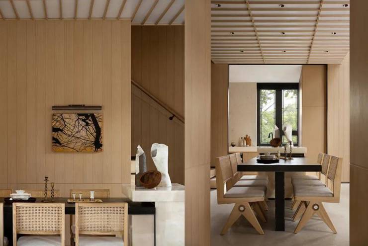 横平竖直的空间线条里,写意纹理如水墨般晕染开来,麻布、不锈钢、玻璃、实木等材质亦悄然置入,东方情韵与现代骨骼大胆融合,相得益彰。