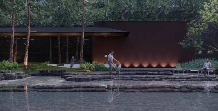 景观设计演绎多种宋代景观特征,再现王希孟《千里江山图》等古画描绘的宋式游园意境,以树、石、瀑、廊、亭的层叠布局,再现宋画简远、疏朗、雅致的宋式园林意境,游园入画。