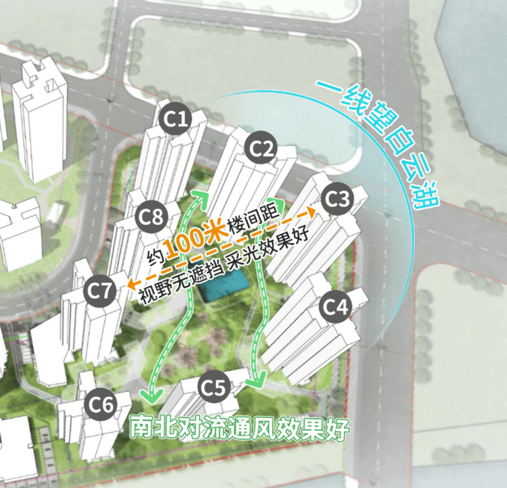 三期规划纯南向高层洋房,低密T4/T5规划,最高楼间距超100m(部分楼间距实测),敬献城市全生命周期精英客群,选择越秀天悦云湖,选择主城区进阶生活方式。