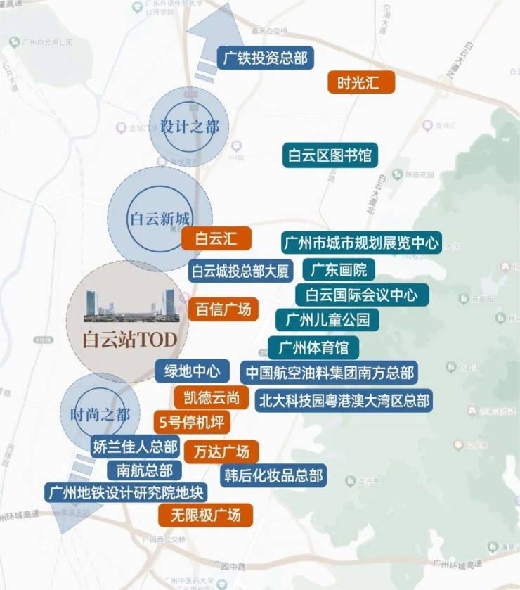 超级枢纽驱动和要素资源高效配置,带动区域产业转型升级及其高端环节的集聚发展。广州白云站TOD将跃升白云产业能级,联通白云新城、设计之都、广州站周边片区,构造黄金三角商圈,链接全球资本与商机,将白云打造成通往世界商贸往来的“国际会客厅”。