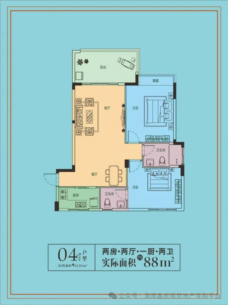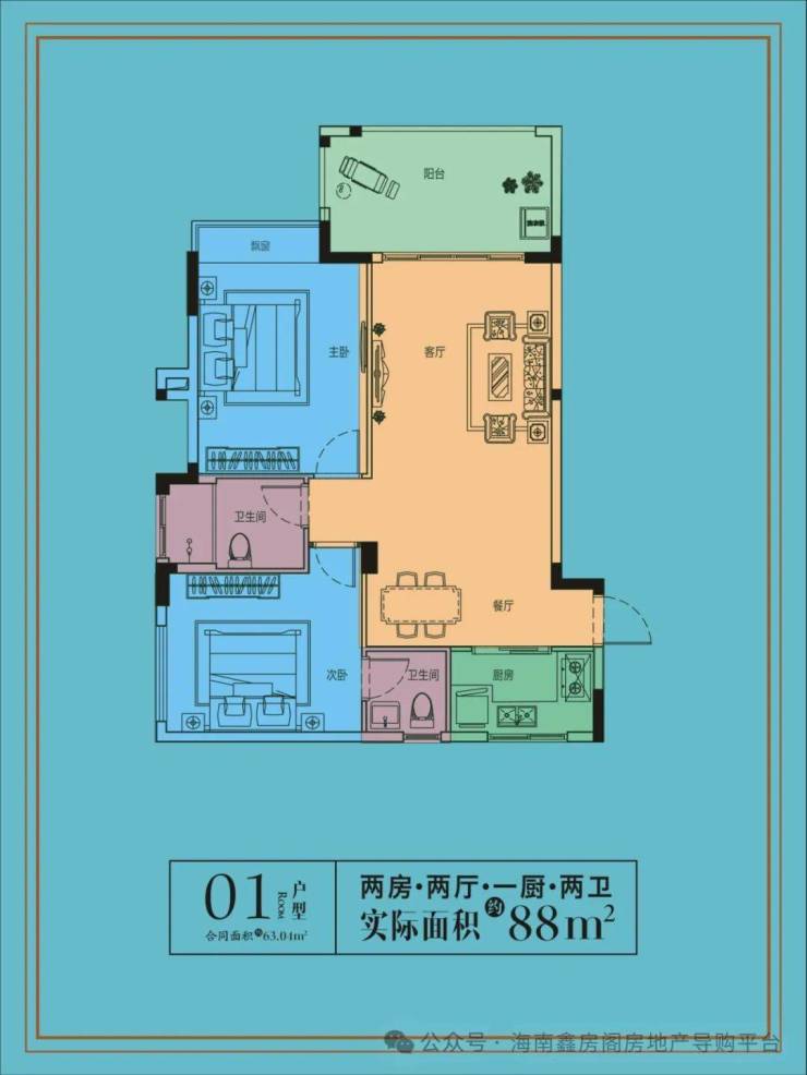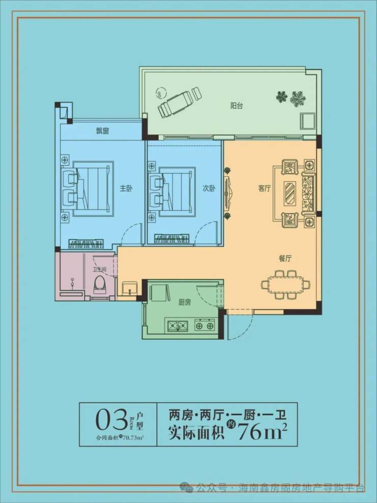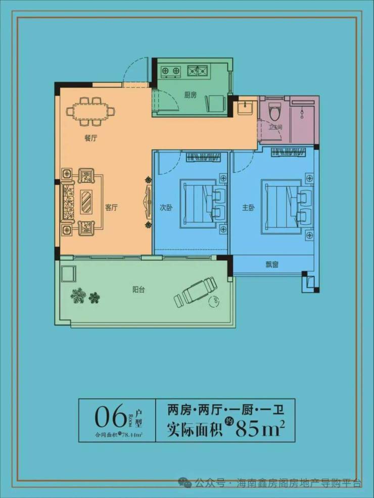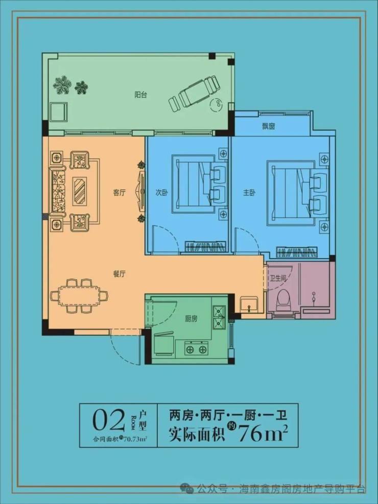 🏡02、03户型:两房两厅一卫,三面都是朝景观面,5.8✖2.4的大阳台,客厅开间3.4米