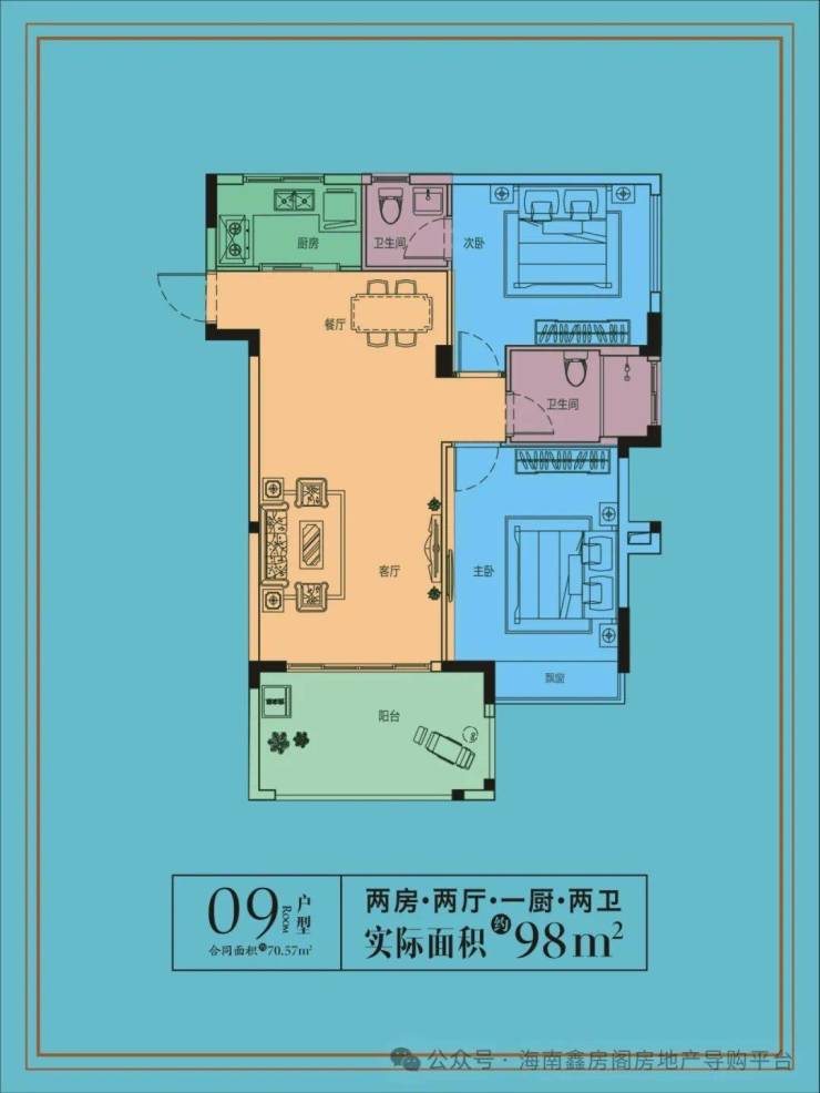 建筑面积:70平米,实得面积98平米南北各一个卧室