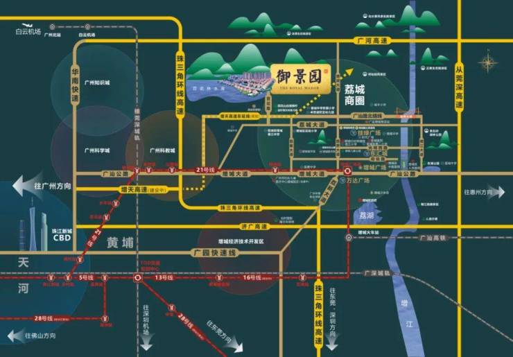 ③交通便利:楼盘位于荔城主城区,广州地铁21号线通达市内各区,周边5大城际高速环绕,门前荔城西环路入口连接珠三角环线、广河高速、广汕公路、广惠高速等,可快速到达珠三角各个城市,交通快捷便利。