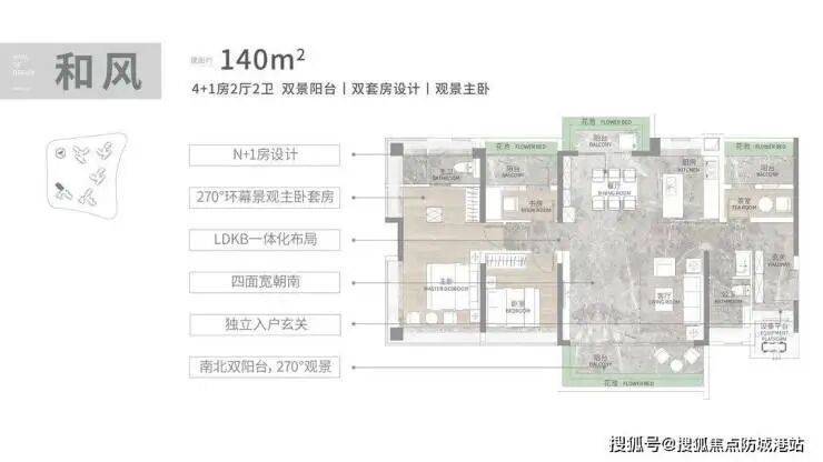 建面 140㎡4+1 房:南向采光面达 15.7 米,南北双阳台保证通风与景观,LDKB 一体化设计让公共空间更显阔绰;主卧配备 270° 折叠屏飘窗,视野开阔,额外拓展空间可定制为家庭影院或健身区,满足高端改善需求。