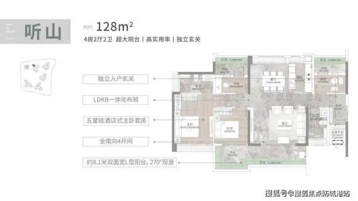 建面 128㎡四房:L 型独立玄关提升归家仪式感,8 米 L 型阳台实现 “观景 + 晾晒” 分区,四开间朝南搭配餐厅全景飘窗,南北对流效果极佳;空间布局均衡,主卧套间与长辈房分离,兼顾私密性与家庭互动,适合二胎家庭。