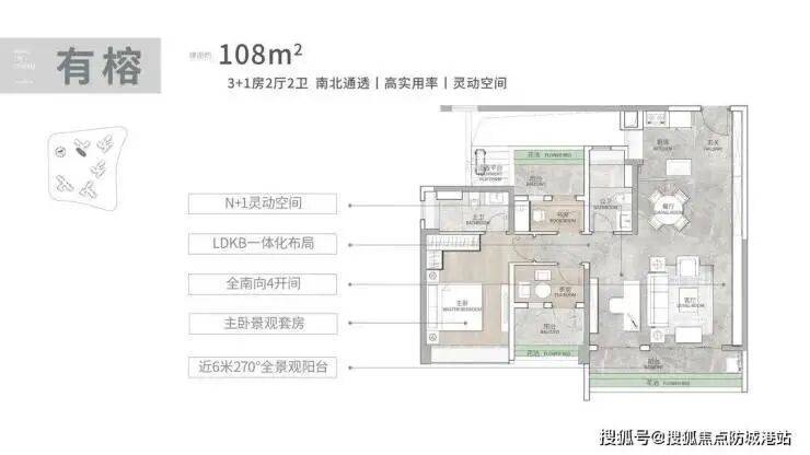 建面 108㎡3+1 房:作为入门级改善户型,四开间朝南,近 6 米南向阳台搭配 270° 景观视野,LDKB 一体化设计打造 5.9 米大方厅,增强家庭成员互动;主卧为奢阔套间,配备南向大飘窗与 L 型衣帽间,额外拓展空间可作书房或儿童房,适合三口之家。