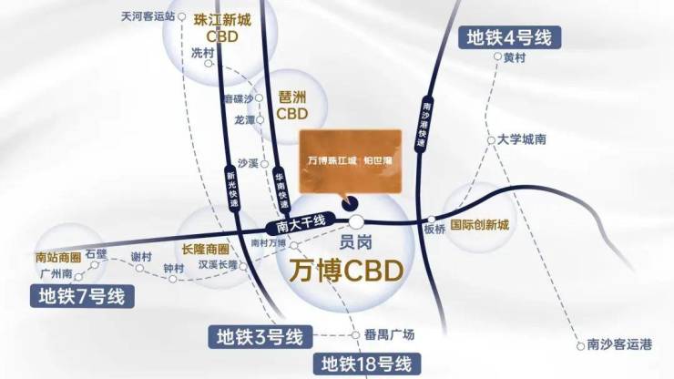 约500米近7号线员岗站,1站万博、5站珠江新城。自驾500米直达南大干线,华快、新光、南沙港快速等多条快速路,交通四通八达,比万博商务区出发到天河海珠的时间还更快,更不用堵车。