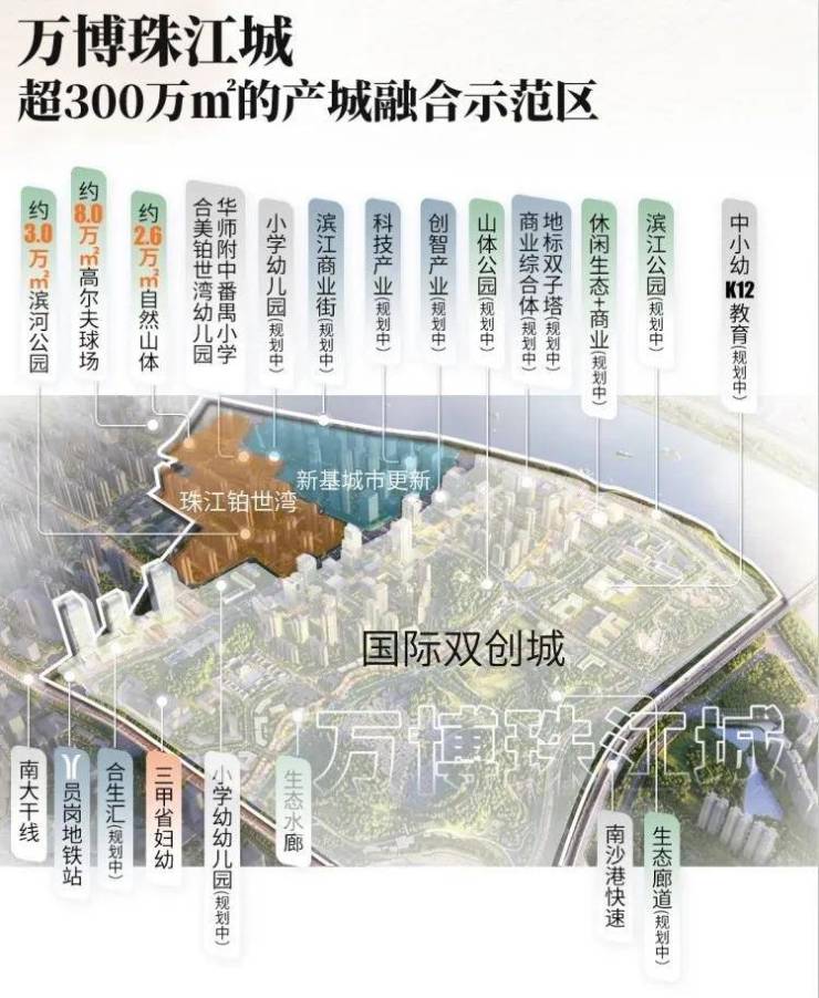 万博珠江城,是由珠江&合生联袂开发打造的超300万㎡产城融合城市超级互联体,集“住宅-商业-产业-交通-教育-生态”于一城。项目分三大块开发,一期是约5000户且成熟兑现的【珠江铂世湾】高端纯住宅区;二期是一线江景的【新基城市更新项目】;三期是计划投资223亿的粤港澳大湾区发展重要节点及省重点建设项目-【广州国际双创城】。