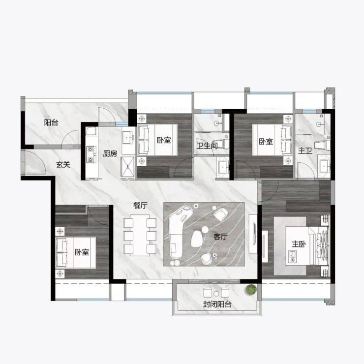 139㎡ 4+1房2厅2卫,约9㎡灵动空间,约7m长都荟宽厅,南向通透四开间,灵动次卧,预留横竖双厅+西厨创意改造,全屋80cm阔景飘窗升级。