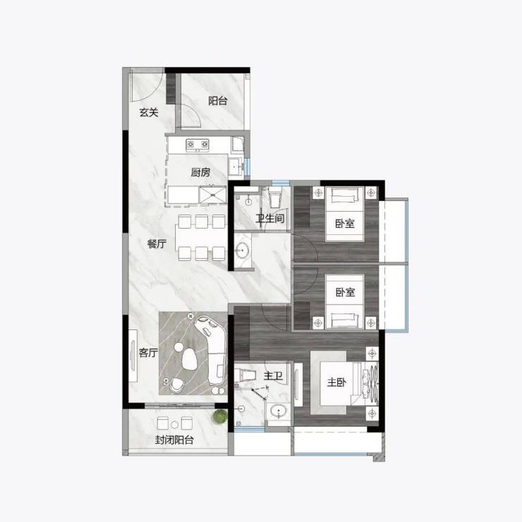 121㎡ 3+1房2厅2卫,L型入户尊崇体验,约8.1m长南北通透都荟宽厅,约5m长270°观景阳台,约46㎡豪宅式社交空间。