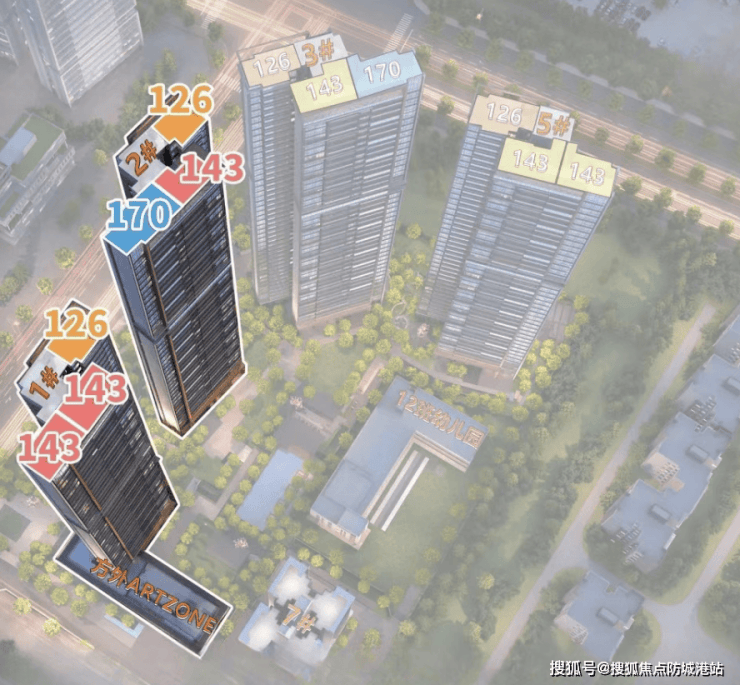 中海麓府体量不大,仅4栋住宅,40多层高(1#高40层,2 - 3#高44层,5#高41层),两梯三户,底下规划有1所12班幼儿园 + 1栋自持物业,货量在500套上下。它的面积段有三种,分别是建面约126㎡三房、143㎡和170㎡的四房。