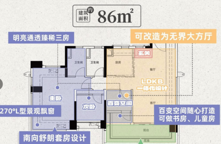 建面86平,三房两卫LDKB设计,南向景观大阳台,全屋动静分离,阳台连通次卧,约6.4米长,主卧带270度景观飘窗,总价266-310万左右。