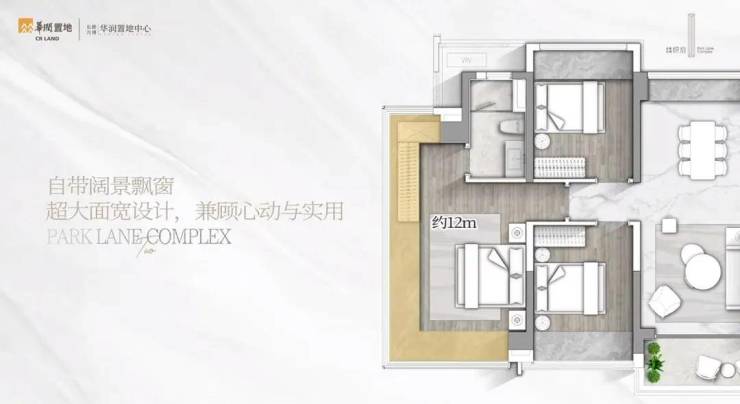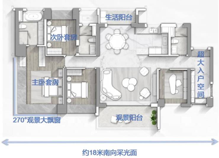 最吸睛的是它的主卧去到28㎡,而且做了约12米长的270°无遮挡U型飘窗,室内光线敞亮,空间通透,非常有豪宅感。
