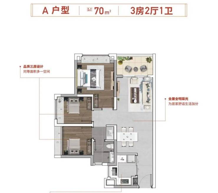【 约70㎡ 3房2厅1卫户型鉴赏】