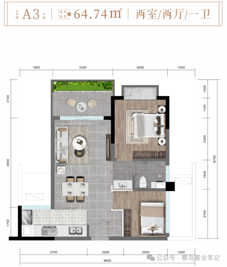 ✨ 6# 楼A3户型约64㎡精致两房两厅一卫