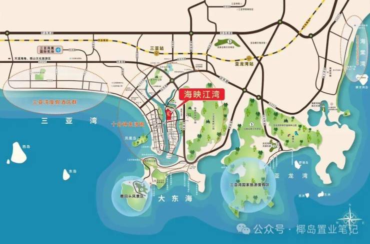 🚗便捷交通:海映江湾项目位于河东路,北接迎宾路,南至鸿洲游艇码头,居三亚城市主干道解放路与凤凰路之间,距离三亚湾直线距离仅1.3公里,距离三亚汽车站约1.4公里,车程约6分钟,距离三亚凤凰岛约2公里,距离大东海旅游区约5公里,车程约13分钟,距离凤凰国际机场14公里,车程约37分钟。距离海棠湾约26公里,车程约40分钟。
