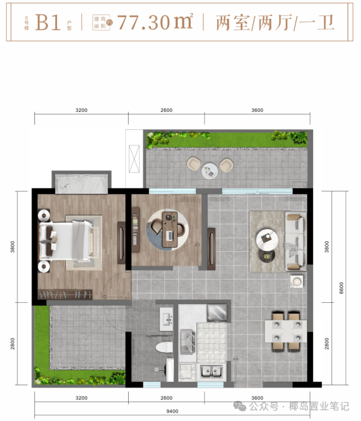 ✨ 6# 楼B1户型约77㎡舒适两房两厅一卫