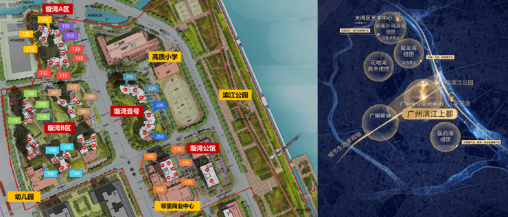 五大组团:璇湾A,B,璇湾1号,2大商办组团(璇湾公馆A,B栋),配建广外附属荔湾小学