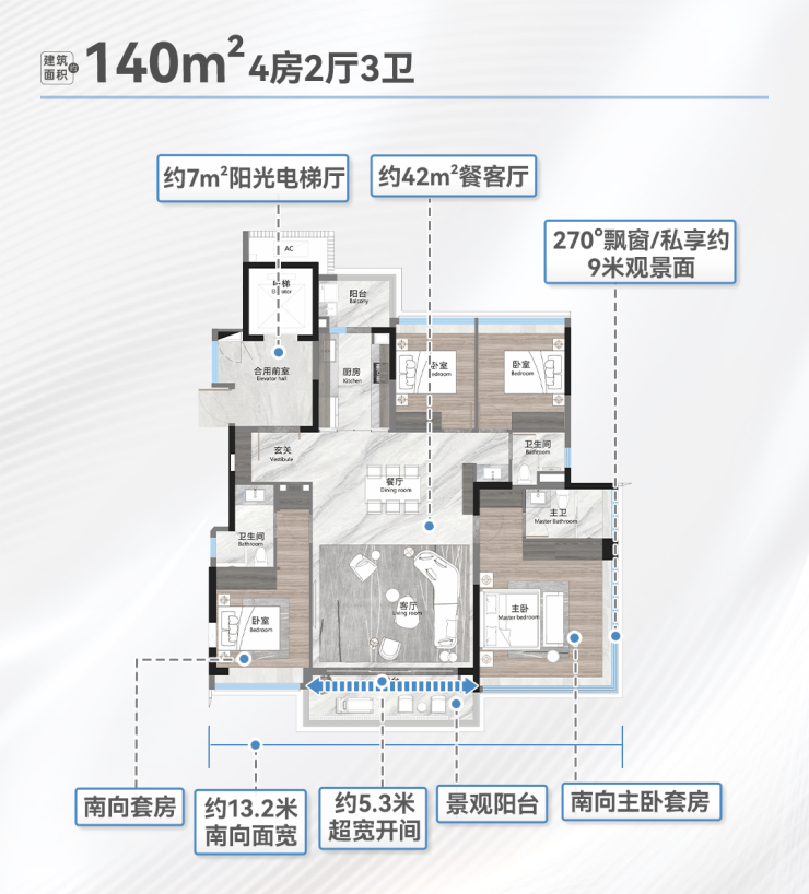 约17米南向面宽,全屋超高窗地比,全南向功能房,主套约270度IMAX级环幕视野