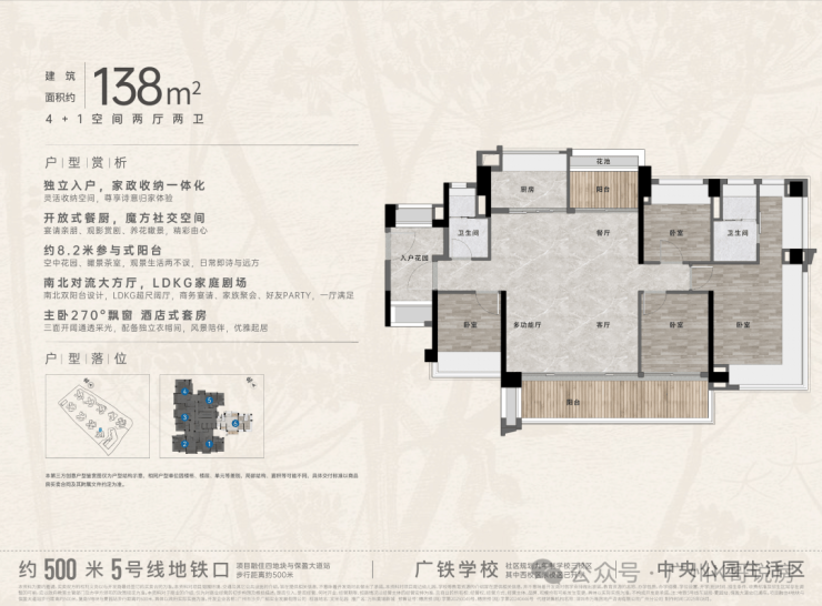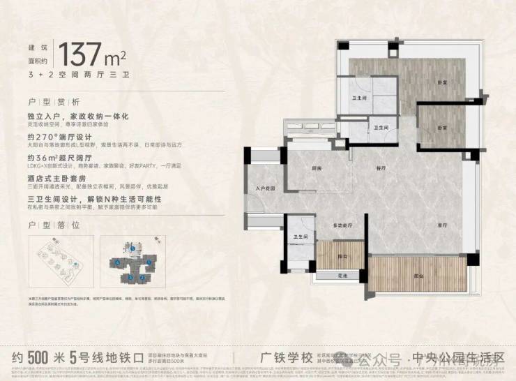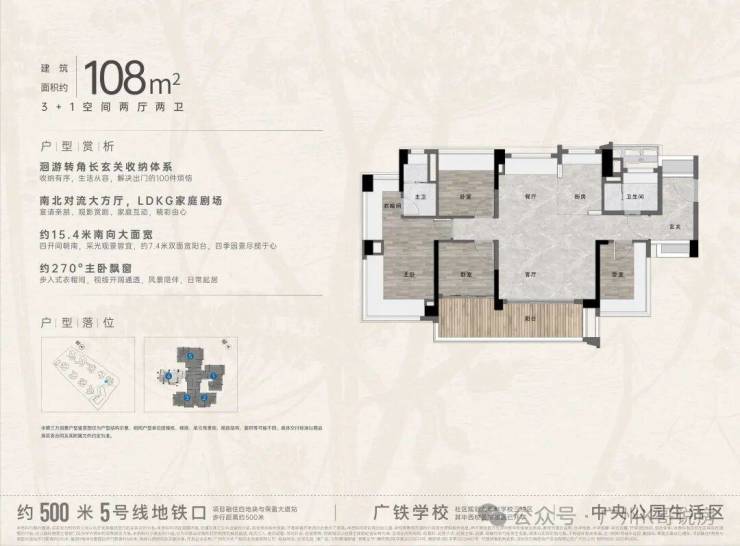 “中央公园”,紧邻大脚印公园,距离地铁约500米,紧邻学校、酒店,户型涵盖75-88㎡三房,105、125、142㎡四房。