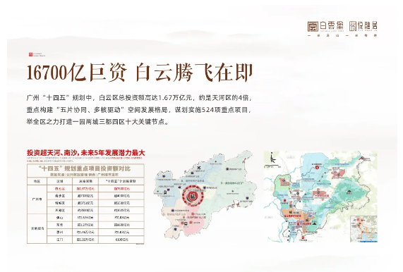 区域发展 广州白云区正处于腾飞时期,十四五规划总投资高达1.67万亿元,正逐步成为广州标志性的高端中央商务区。白云新城汇聚航空、生物医药等多类高端产业,设计之都集聚大湾区创新设计品牌,前景广阔。