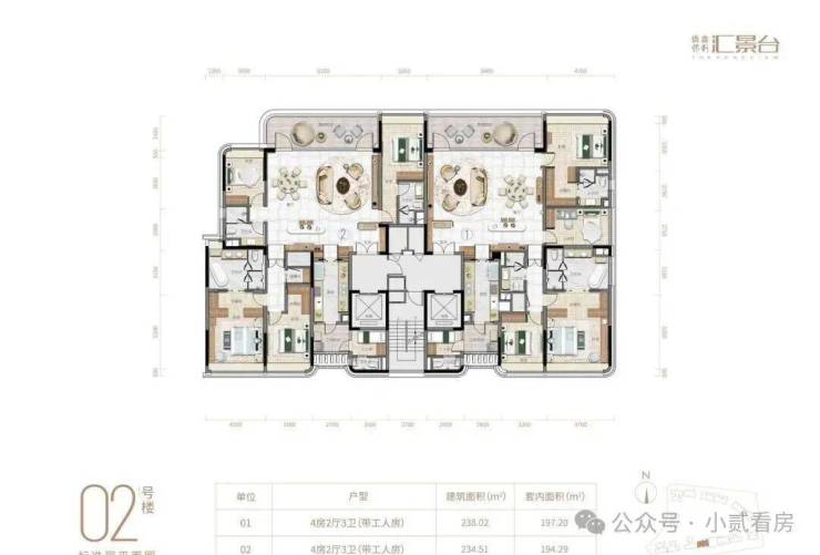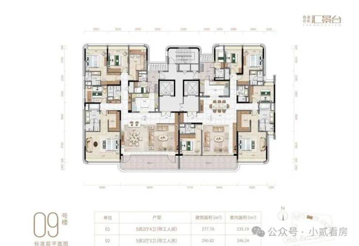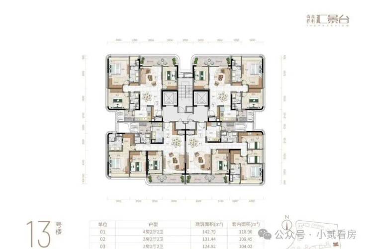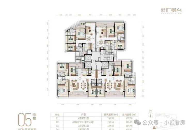 项目由14栋12层小高层组成,产品涵盖123-352㎡三至五房,共8类户型,户型实用率约82-84%